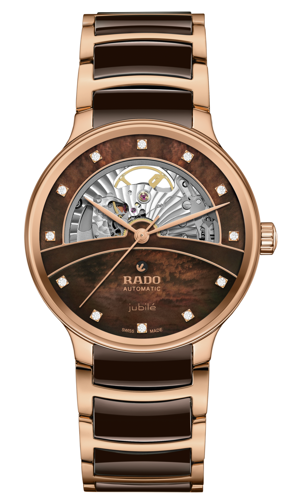 Experience the harmonious blend of artistic expression and design stylings with the Rado Centrix Open Heart watch. As the constellations write their eternal stories above our heads, they build bridges for lovers to meet. A large window, reminiscent at once of dawn and dusk, beautifully frames a state-of-the-art R734 automatic movement with 80 hours of power reserve and an antimagnetic NivachronTM hairspring, as well as a deeply elegant rippled-sunlight "ondulé soleil" motif on chosen component surfaces. The overall appearance of this iconic timepiece is completed with adjusted case lugs and a bracelet made of polished rose-gold-coloured PVD-coated stainless steel with brown high-tech ceramic middle links. The dark brown mother-of-pearl dial with 12 diamonds, emphasised with the rose gold coloured printed “jubilé” logo, matches perfectly with the hands. The watch is water resistant down to 50 m and is also available in M size.