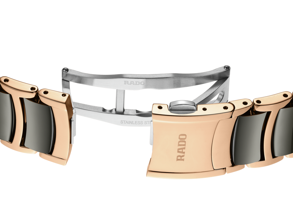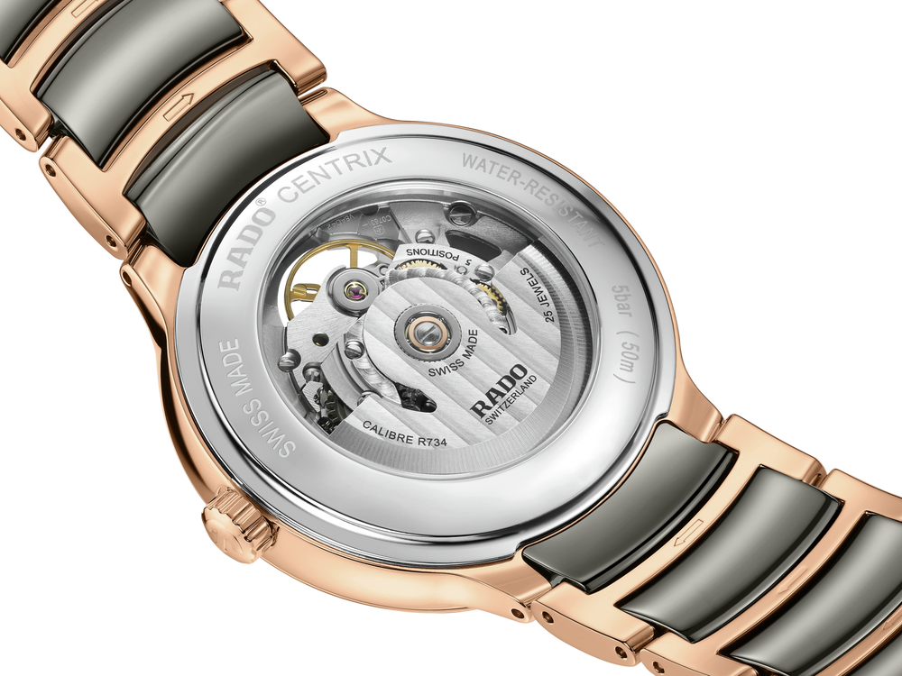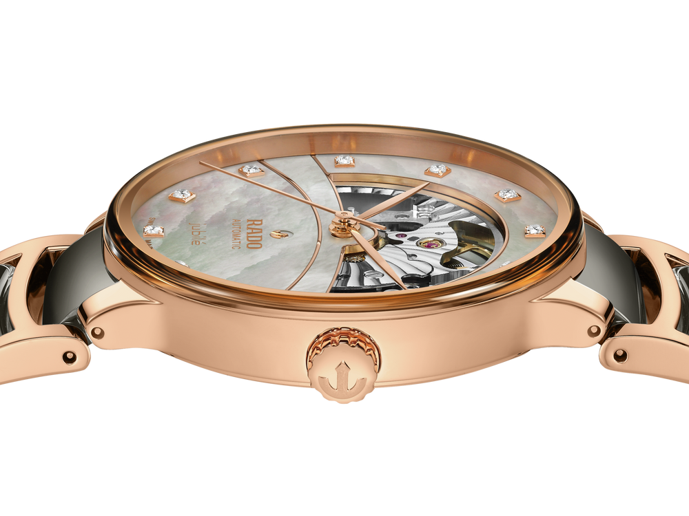 Experience the harmonious blend of artistic expression and design stylings with the Rado Centrix Open Heart watch. As the constellations write their eternal stories above our heads, they build bridges for lovers to meet. A large window, reminiscent at once of dawn and dusk, beautifully frames a state-of-the-art R734 automatic movement with 80 hours of power reserve and an antimagnetic NivachronTM hairspring, as well as a deeply elegant rippled-sunlight "ondulé soleil" motif on chosen component surfaces. The overall appearance of this iconic timepiece is completed with adjusted case lugs and a bracelet made of polished rose-gold-coloured PVD-coated stainless steel with plasma high-tech ceramic middle links. The light silver mother-of-pearl dial with 12 diamonds, emphasised with the rose gold coloured printed “jubilé” logo, matches perfectly with the hands. The watch is water resistant down to 50 m and is also available in M size.