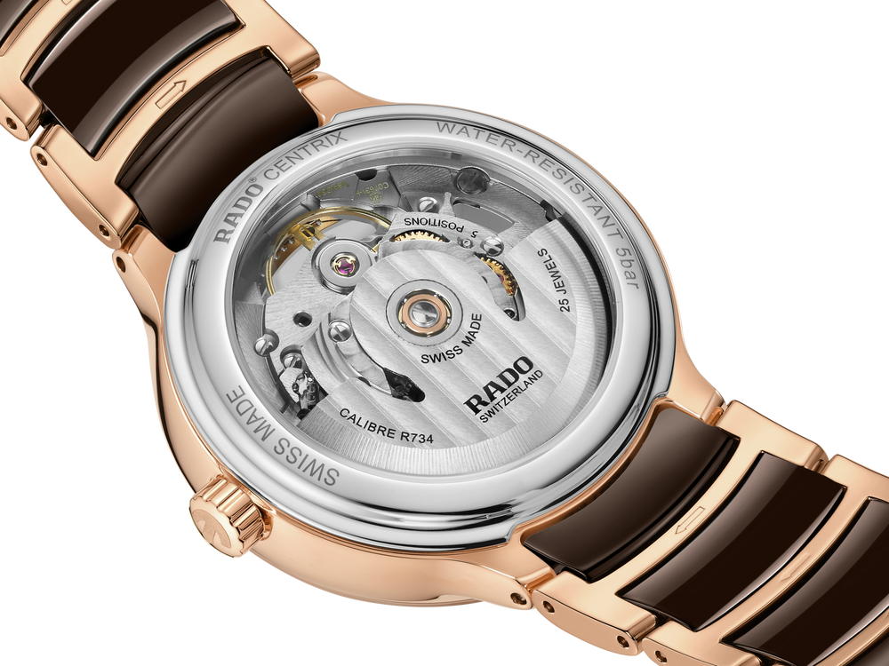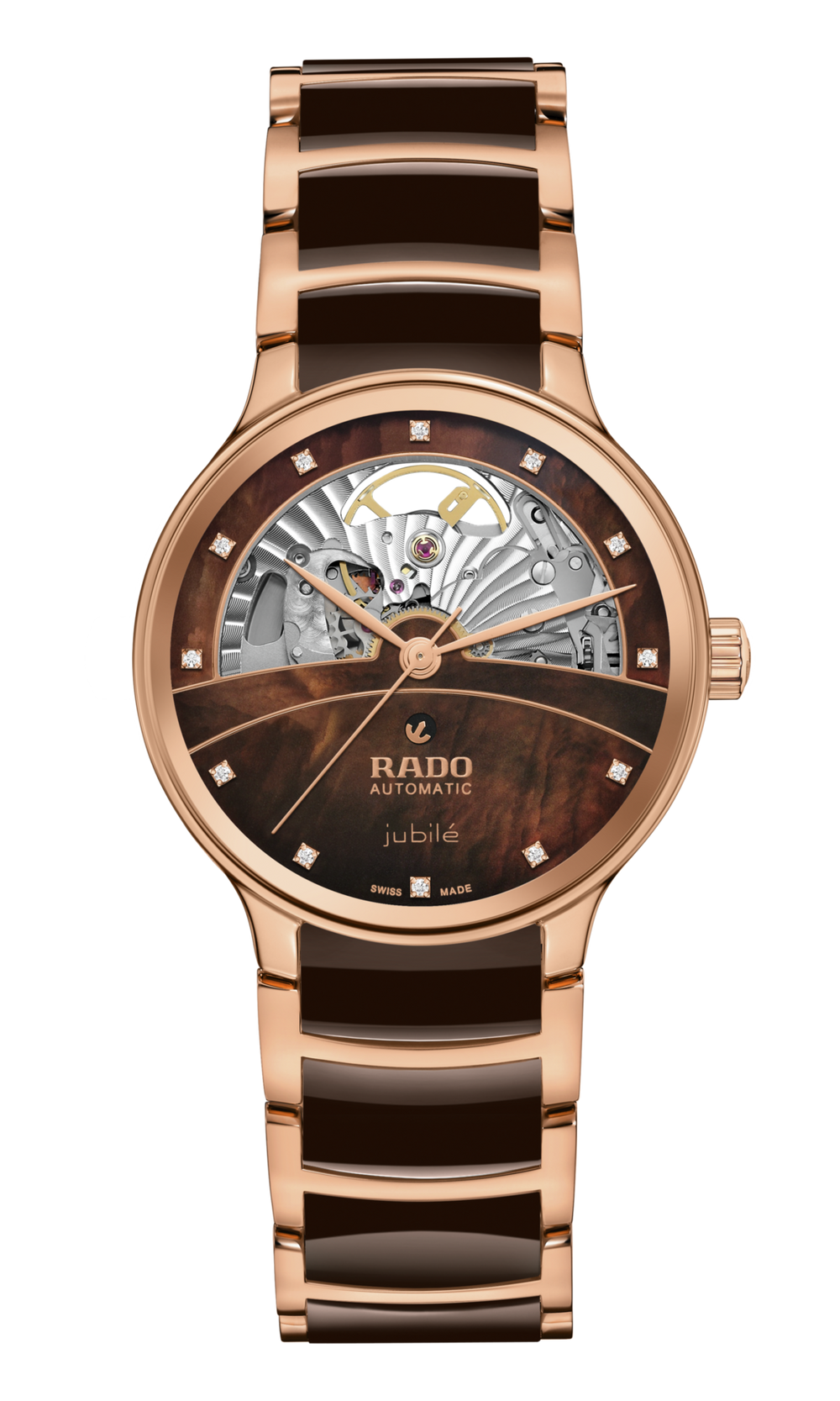 Experience the harmonious blend of artistic expression and design stylings with the Rado Centrix Open Heart watch. As the constellations write their eternal stories above our heads, they build bridges for lovers to meet. A large window, reminiscent at once of dawn and dusk, beautifully frames a state-of-the-art R734 automatic movement with 80 hours of power reserve and an antimagnetic NivachronTM hairspring, as well as a deeply elegant rippled-sunlight "ondulé soleil" motif on chosen component surfaces. The overall appearance of this iconic timepiece is completed with adjusted case lugs and a bracelet made of polished rose-gold-coloured PVD-coated stainless steel with brown high-tech ceramic middle links. The dark brown mother-of-pearl dial with 12 diamonds, emphasised with the rose gold coloured printed “jubilé” logo, matches perfectly with the hands. The watch is water resistant down to 50 m and is also available in L size.