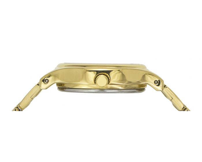 This easy to read oval shaped gold tone bracelet watch with a white dial pairs well with your festive attire