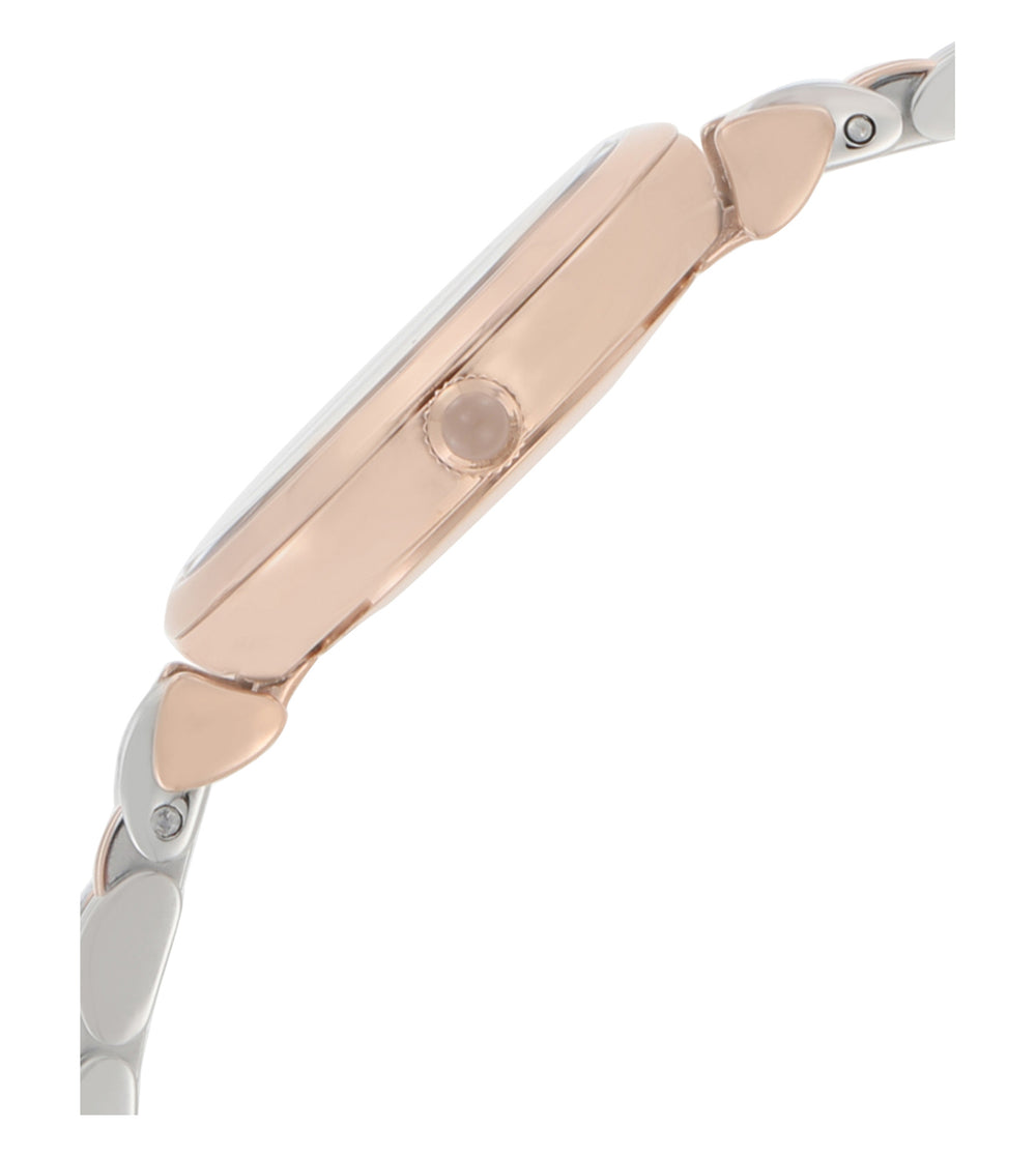 A must-have timepiece for all the watch aficionados, this women's analog watch from Emporio Armani will be a perfect pick. Its strap vaunts a silver and rose gold hue that enhances the look of the watch. Housed in a case, the beige round dial is protected by a mineral glass. It showcases plain 2-hand, and a crown for time adjustment. Furthermore, it is complemented with a jewellery clasp clasp that ensures a secure fit on the wrist.