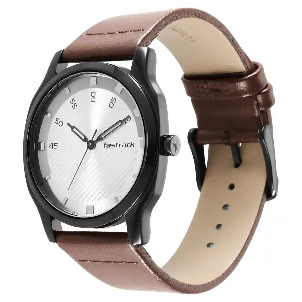 Operated by a quartz movement, the silver round dial is encased in a 46.5 mm case. It features plain three hands and a crown for time adjustment. The genuine leather strap exudes a brown hue that accentuates the look of the watch. Set in a high-shine case, this men's analog watch from the Stunners collection by Fastrack is sure to catch your attention.