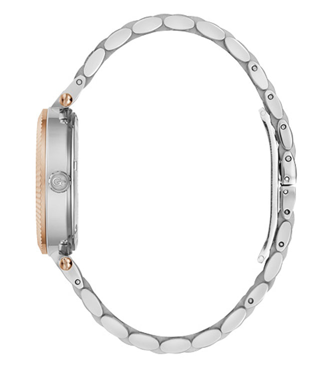 Style arrives effortlessly the moment you wear this smartly designed women analog watch from Gc. The white round dial is protected by a mineral glass. The stainless steel strap comes in a silver and rose gold hue that further elevates the look of the timekeeper. Besides, it is completed with a folding clasp to ensure a secure fit on the wrist.