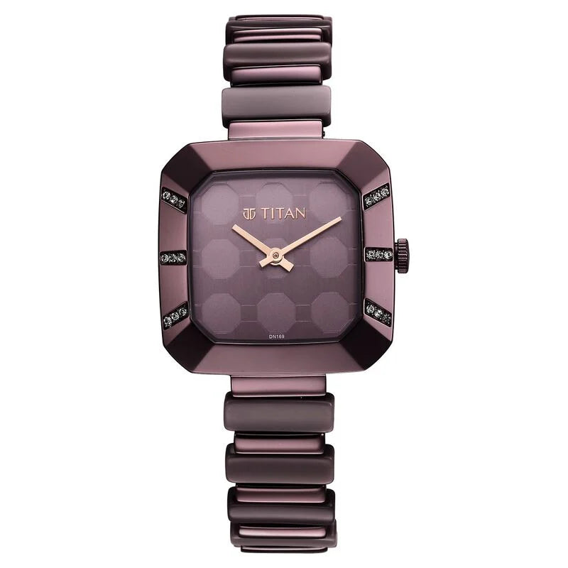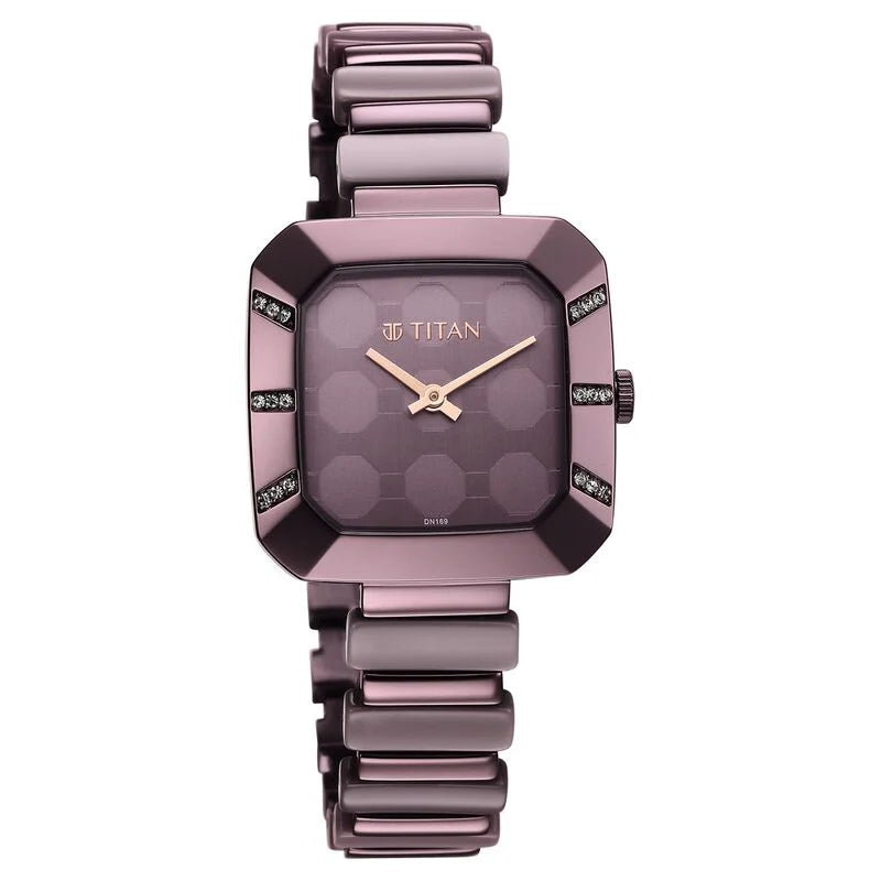 Dazzle in a square-cased timepiece with intricate stone detailing on the bezel and a glamorous purple dial. The circle detailing adds a touch of sophistication, while the purple plastic strap ensures comfort, making it an ideal accessory for casual dates and shopping. Make a fashion-forward statement with this stylish and vibrant purple watch.