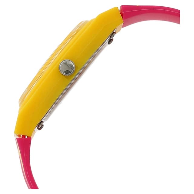 This adorable watch has a multicoloured printed dial housed within a stainless steel case. It indicates time with Arabic numeric indices. It has a pink and yellow printed strap that is secured with a buckle clasp. It offers a water resistance of up to 3 ATM.