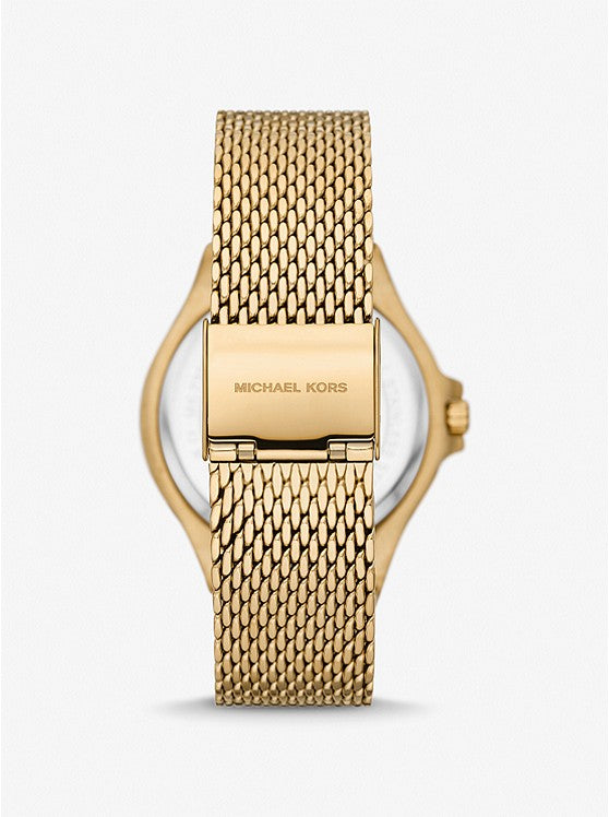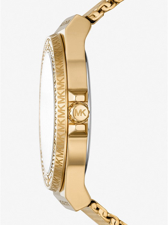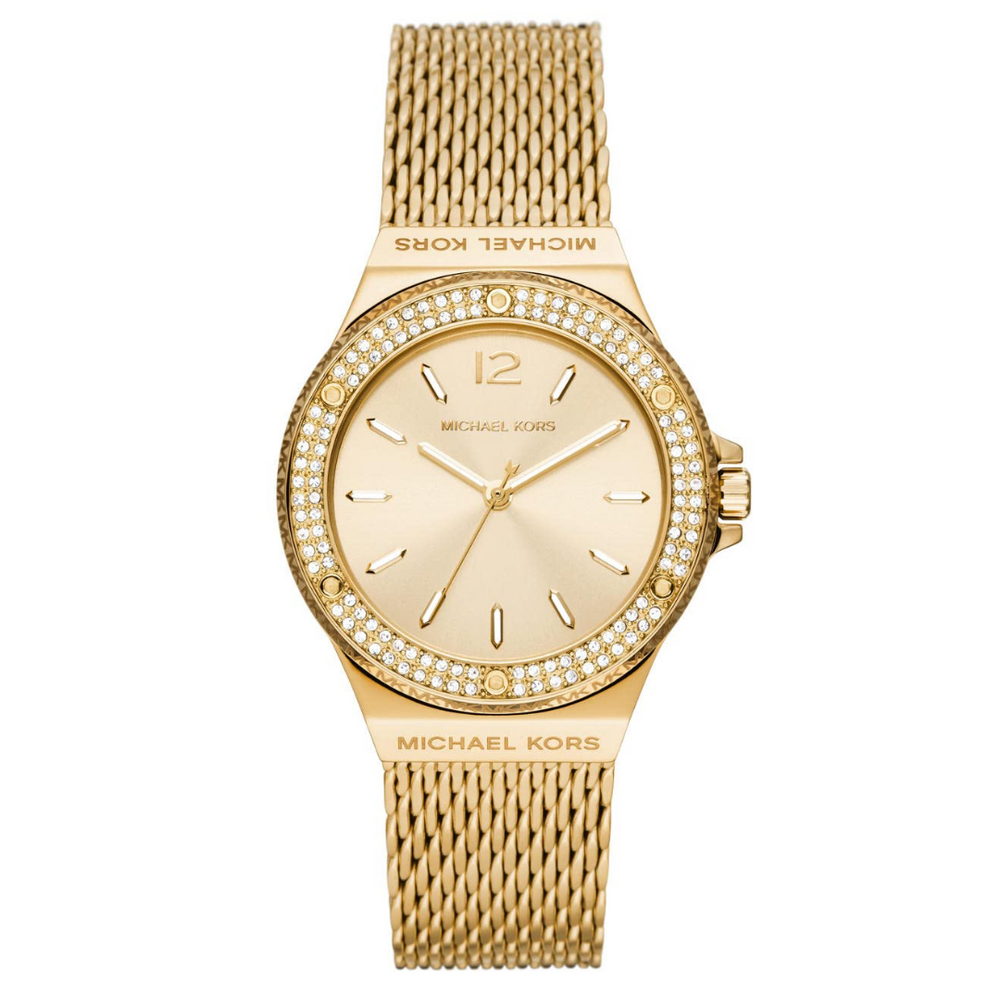 Meet Lennox: a versatile timepiece with statement-making appeal. Crafted from gold-tone stainless steel in a slim profile, this watch features a sleek mesh bracelet and a topring embellished with pavé crystals. Slip it on to elevate any outfit.