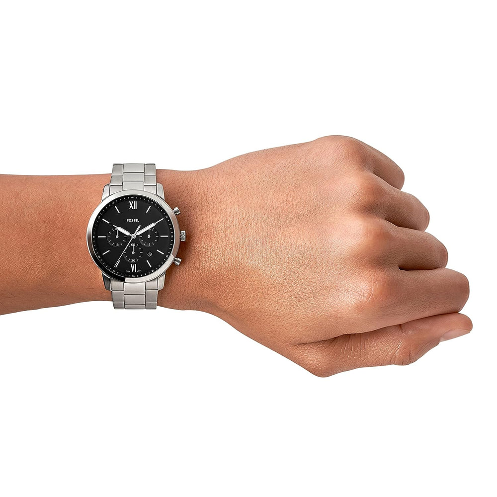 Amaze everyone around you by wearing this men's chronograph watch from FOSSIL.The black round dial is protected by a mineral glass. The stainless steel strap comes in a silver hue that further elevates the look of the timekeeper. Besides, it is completed with a push button clasp to ensure a secure fit on the wrist.