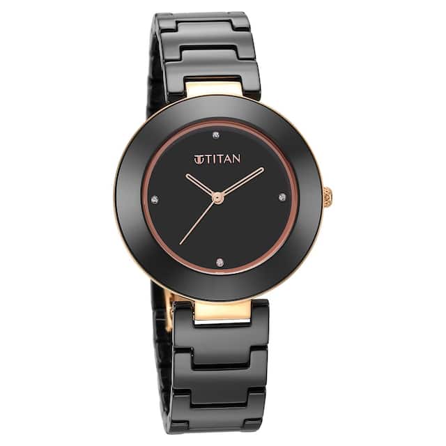 This women's analog watch from the Purple collection by Titan is an exquisite timepiece that has a classic style with a contemporary touch. Functional on a quartz movement, the black round dial is housed in an elegant case. It displays plain three hands and a crown for time adjustment. The ceramic bracelet flaunts a black hue that accentuates the look of the watch.