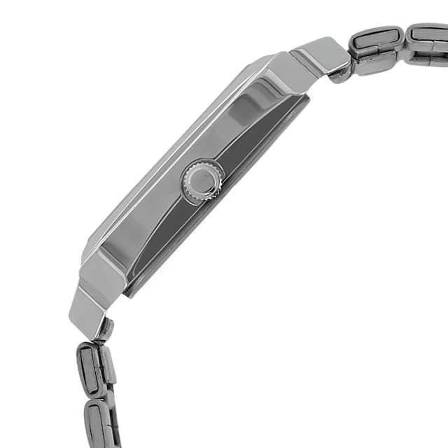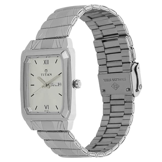 This analog watch for men has a rectangular, silver-white dial, featuring three plain hands, Roman numerals at the 6th and 12th hour intervals, slanted markings at the 5 minute intervals and a day and date display at the 3rd hour intervals. The dial is enclosed in a silver colour case that has a crown. Made of stainless steel, its silver colour strap is fitted with a special three piece sliding clasp.