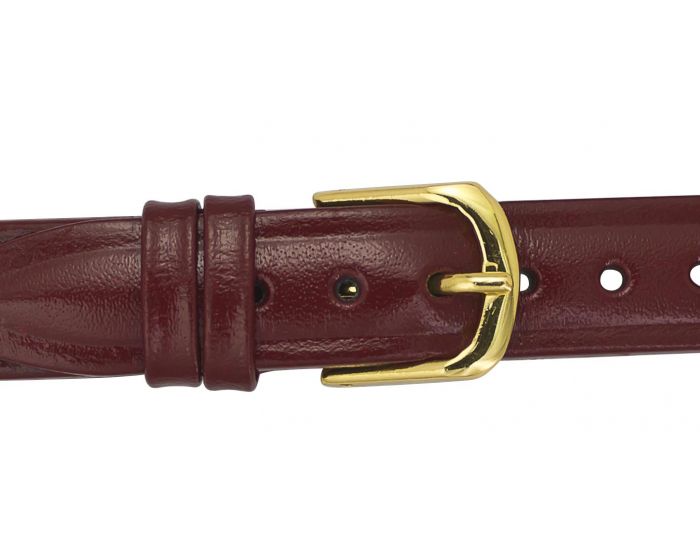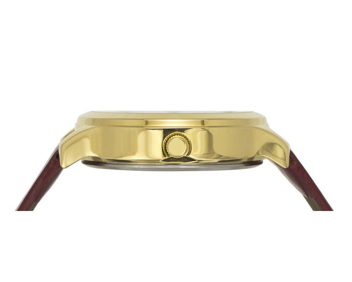 This trendy leather strap watch with a golden dial and crystal accents is a definite head-turner
