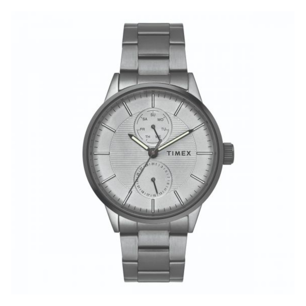 Full gun metal dressy men's multifunction watch with stamped textured grey dial & a domed crystal