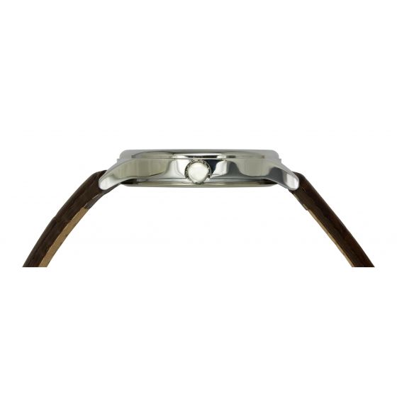 Earn admiration for your rich sense of style by wearing this men's analog watch from Timex. Its genuine leather strap exudes a brown hue that accentuates the look of the watch. Operated by a quartz movement, the white round dial features plain three hands, day and date display and a crown for time adjustment. Furthermore, it is complemented with a buckle clasp that ensures a secure fit on the wrist.