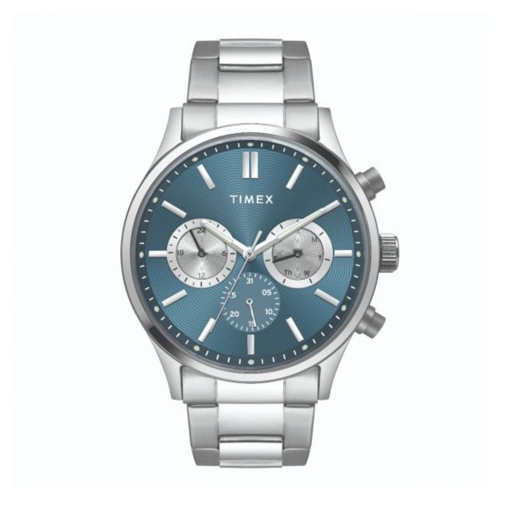 All stainless steel multifcution watch with dual tone light blue layered dial comes with stainless steel bracelet