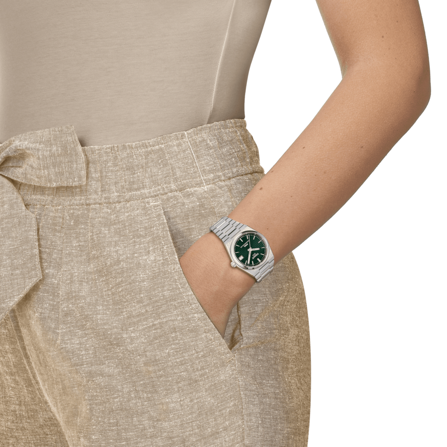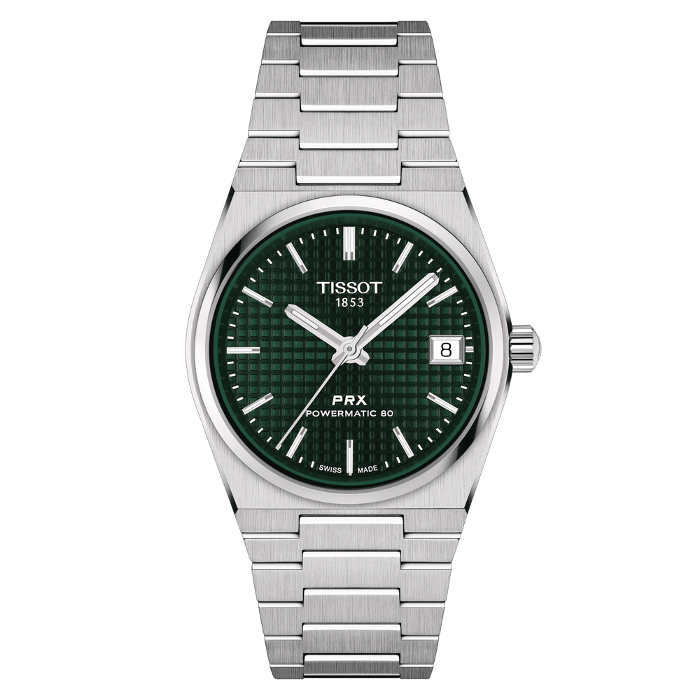 Experience the Tissot PRX 35mm Powermatic 80, a harmonious fusion of vintage charm and contemporary functionality. This 35mm watch showcases a high-quality steel case and a striking green dial, paying tribute to its classic 1978 heritage. The unique waffle dial pattern brings depth and character to the automatic model. With water resistance up to 100 meters and a Nivachron™ balance hairspring, the PRX offers reliability and style for the modern watch enthusiast. The satin-finish steel bracelet with a triple-blade folding steel clasp ensures lasting comfort. Elevate your style with the Tissot PRX 35mm Powermatic 80 in green.