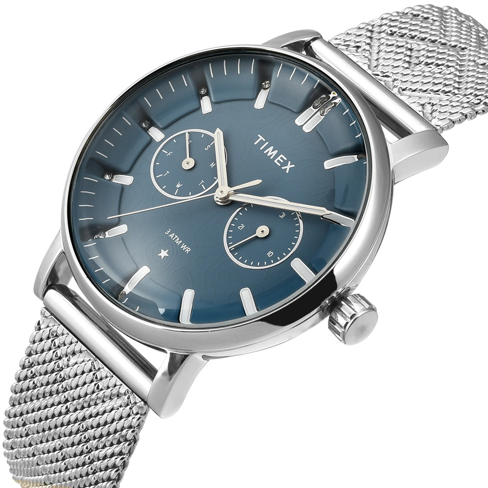 The Timex TWEL20301 Women's Watch offers a chic, layered look with its cosmic-inspired black dial, housed in a rose Silver-tone case and paired with a vibrant Silver Mesh Bracelet . This stylish timepiece combines elegance with a bold twist, making it a perfect accessory for the fashion-forward woman.