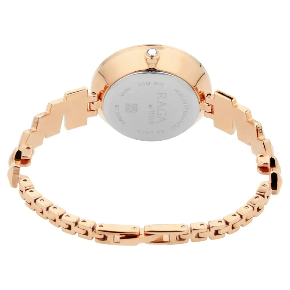 Make a distinct style statement wearing this women's analog watch from the Raga Facets collection by Titan. Enclosed in a 31 mm case, the rose pink round jaali patterned dial comes filled with 70 free-flowing dancing Swarovski crystals. It displays plain three hands and a crown for time adjustment. The metal strap with glossy finish vaunts a rose gold hue that enhances the look of the watch. Besides, it is finished with a jewellery clasp that provides a secure fit on the wrist.