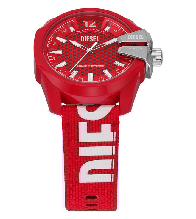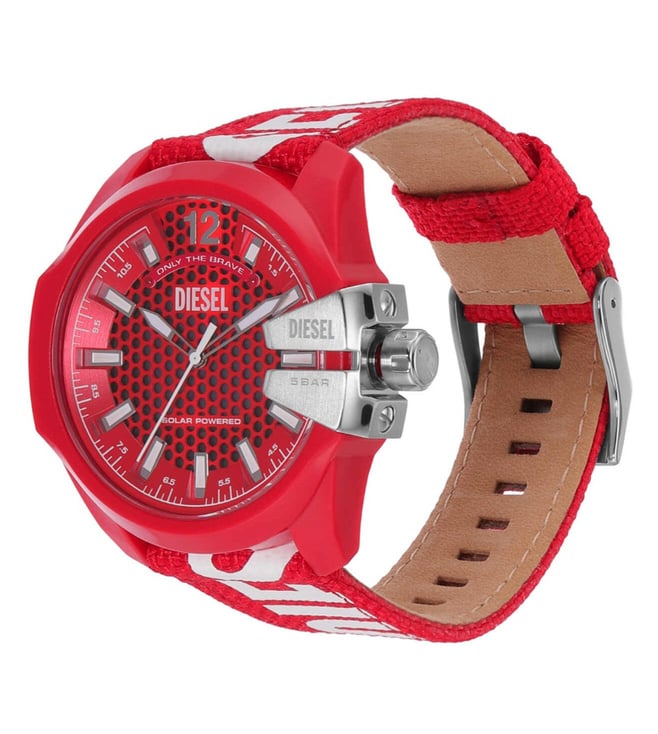 Add a stylish dimension to your look by wearing this men's analog watch from Diesel. The red round dial is protected by a mineral glass. The pu strap comes in a red hue that further elevates the look of the timekeeper. Besides, it is completed with a buckle clasp to ensure a secure fit on the wrist.