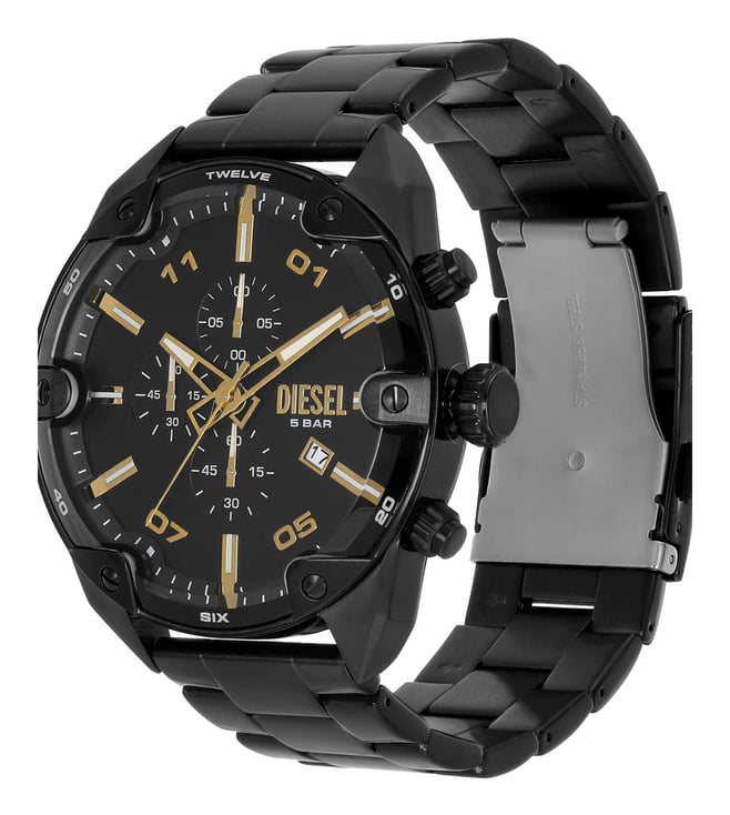 A must-have timepiece for all the watch aficionados, this men's analog watch from Diesel will be a perfect pick. The black round dial is protected by a mineral glass. It has a crown for time adjustment. The stainless steel strap comes in a black hue that further elevates the look of the timekeeper. Diesel's 49mm Spiked watch features a black sunray dial, chronograph movement and black stainless steel bracelet.