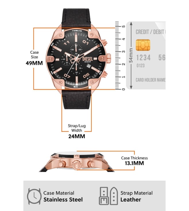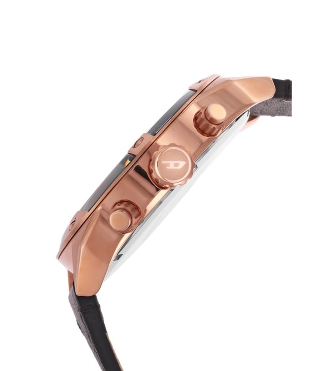 A must-have timepiece for all the watch aficionados, this men analog watch from Diesel will be a perfect pick. Its strap vaunts a black hue that enhances the look of the watch. Housed in a case, the black round dial is protected by a mineral glass. It showcases chronograph, and a crown for time adjustment. Furthermore, it is complemented with a buckle clasp that ensures a secure fit on the wrist.