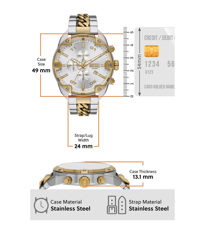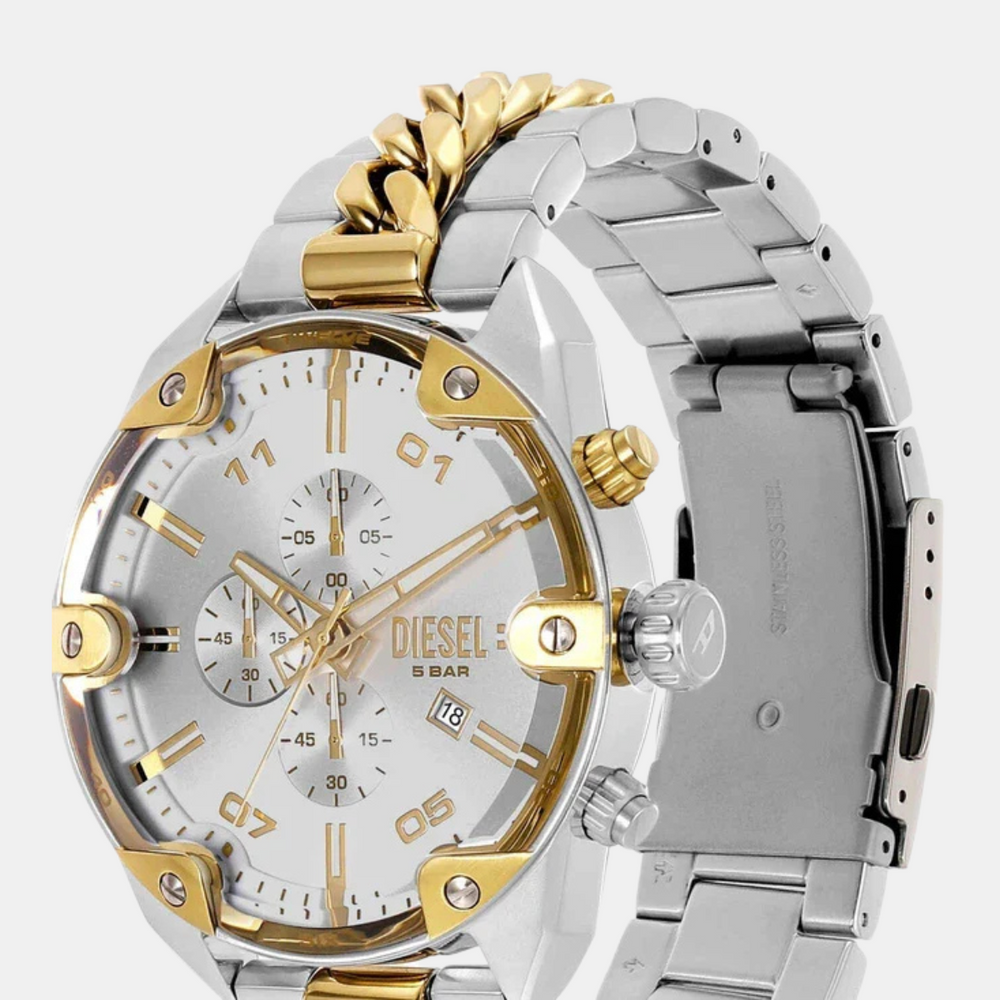 Do not settle for an ordinary watch when you can have a Spiked two-tone watch by Diesel. This striking 49 mm watch features a stylish sunray dial with chronograph movement that keeps you in sync with the time and trends. The two-tone stainless steel chain-inlay bracelet adds a touch of glamour, making it the perfect accessory for your outfit.