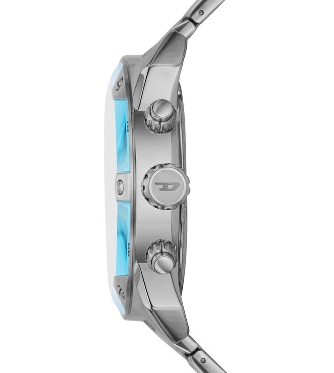 Enhance your style quotient by wearing this men's analog watch from Diesel. The blue round dial is protected by a mineral glass. It has a crown for time adjustment. The stainless steel strap comes in a silver hue that further elevates the look of the timekeeper. Diesel's 49mm Spiked watch features a blue sunray dial, chronograph movement and stainless steel bracelet.