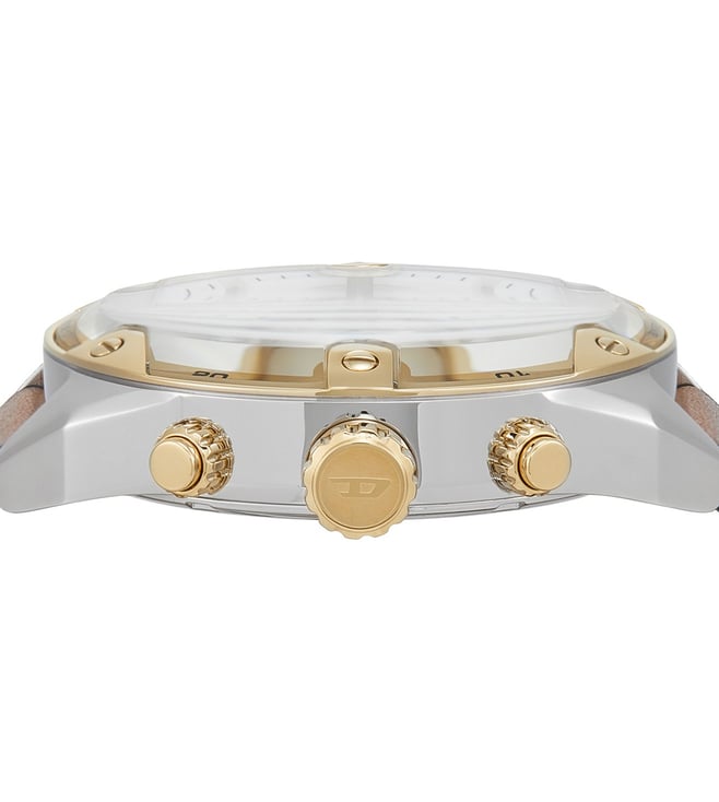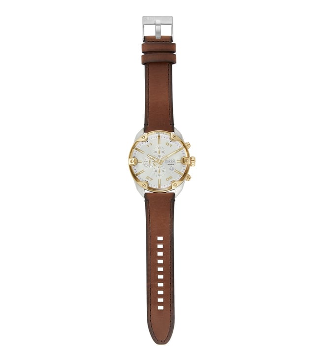 Add a classy touch to your attire by wearing this men analog watch from Diesel. the silver round dial is protected by a mineral glass. It has a crown for time adjustment. The genuine leather strap flaunts a brown hue that accentuates the look of the watch. Besides, it is completed with a pin buckle clasp to ensure a secure fit on the wrist.