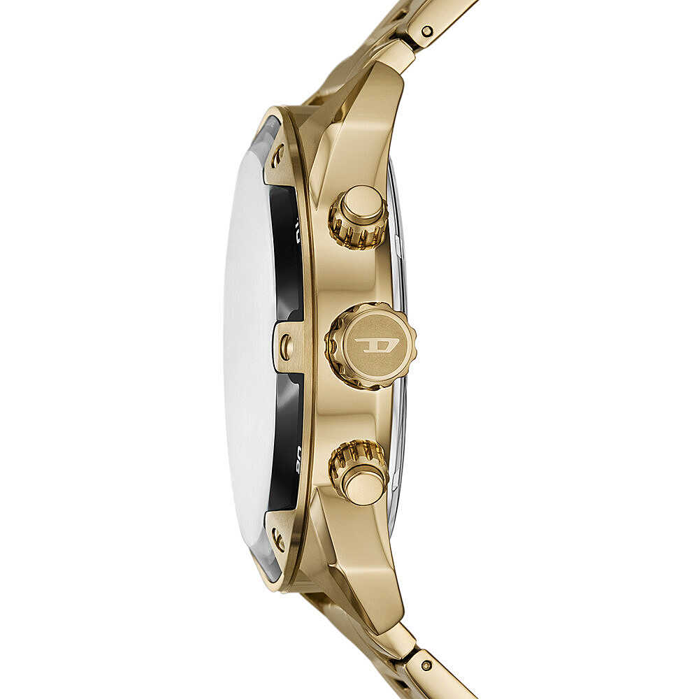 Diesel men's quartz/chronograph watch from the Spring collection. Watch with a round shape mixed gold-tone finish stainless steel case. Case size: 49 mm. Thickness: 13 MM. The glass is transparent. The dial is black. Lug distance: 24 MM. The strap is a mixed-finish stainless steel bracelet. The color is gold with a deployant clasp. Water resistance of 5 ATM. The reference is DZ4678. This chronograph will be shipped with the original box Diesel if provided by the brand
