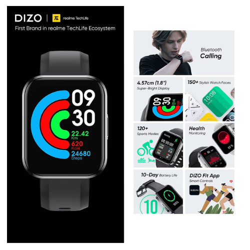 DIZO SMARTWATCH D TALK DW32051 CLASSIC BLACK Talk 1.8 display with calling&7 day battery (by realme Techlife) (Black Strap, Free Size)