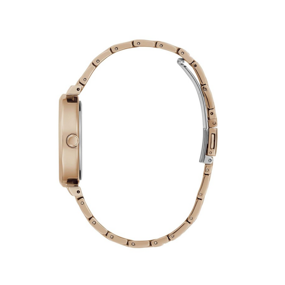 Add a stylish dimension to your look with this watch from Guess. Housed in a 34 mm case, the dial is shielded with mineral glass and runs on a quartz movement. It is water resistant up to 30 m and is finished with a push button clasp to guarantee a snug fit on the wrist. It is a stylish and elegant timepiece. It combines both durability and a classic design. The dial adds a touch of sophistication, making it suitable for various occasions. This watch is an excellent choice for those who appreciate a fashionable and chic accessory that complements their personal style with a touch of glamour.