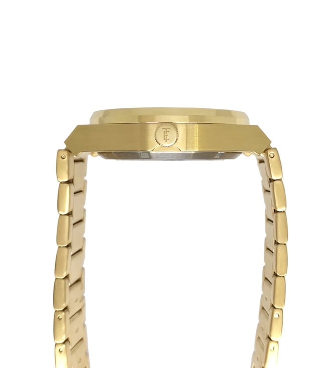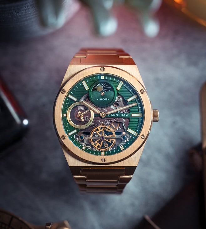 Lending a contemporary twist to an elegant design, this men analog watch from EARNSHAW is a must-have wrist essential. Its stainless steel strap comes in a shade of gold that elevates the look of the watch. The green round dial is secured by a sapphire glass. It has a crown for time adjustment. Furthermore, it is completed with a fold-over clasp with double push button safety clasp to ensure a secure fit on the wrist.