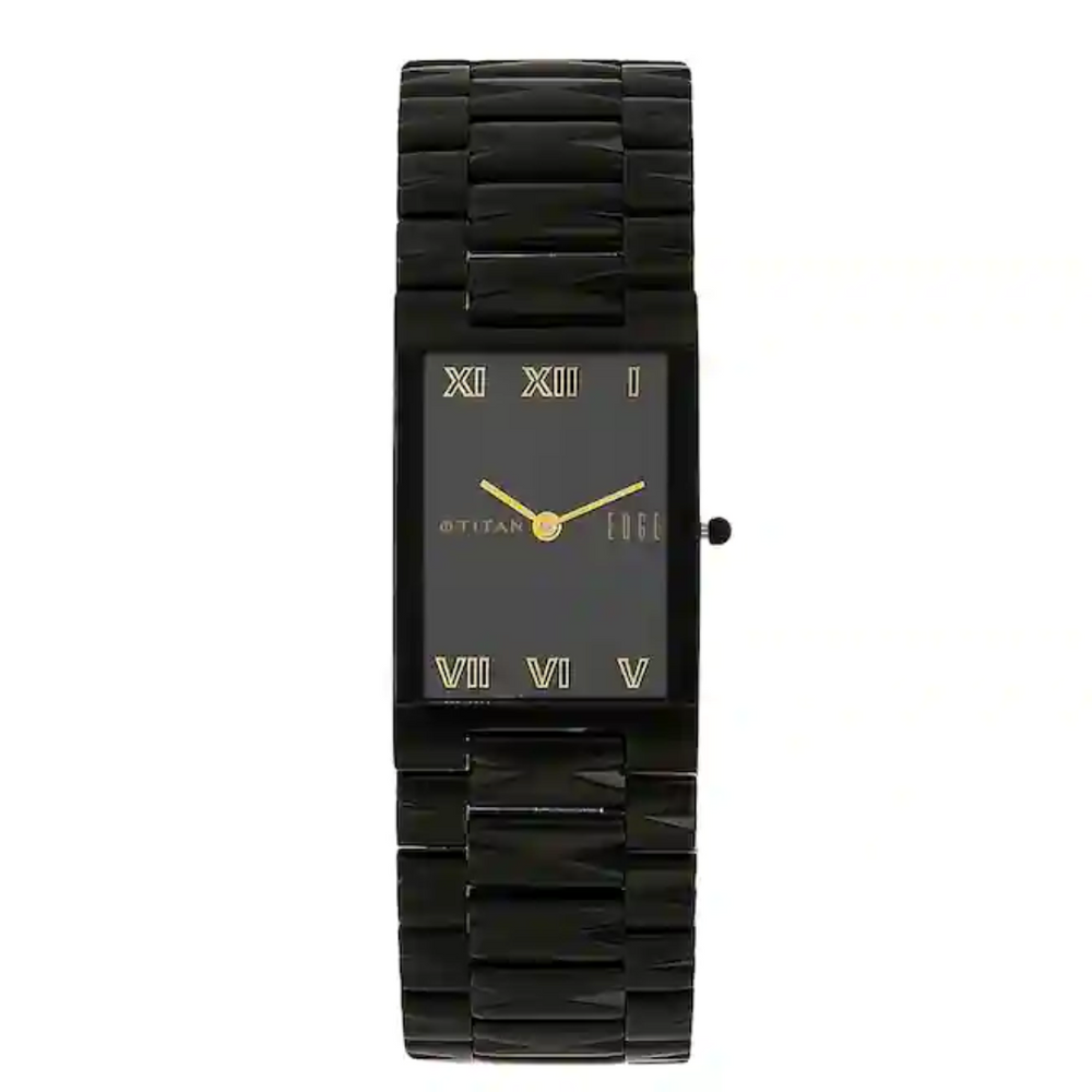 This analog watch for men features a rectangular, black dial. Enclosed in a black case with a crown that lets you adjust the time, the dial has plain two hands and Roman numerals marking the first, fifth, sixth, seventh, eleventh and twelfth hour intervals. The black, stainless steel strap is fitted with push button butterfly clasp. Equipped with 3 ATM water resistant depth, the timepiece is user-friendly. It comes with a 24 month warranty.