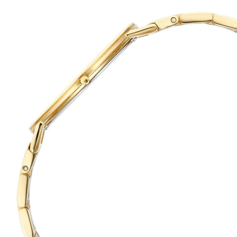 Accessorize your wrist with this men's analog watch from the Edge collection by Titan and make a style statement. Operated by a quartz movement, the silver round dial is encased in a 38.4 mm case. It features plain two hands and a crown for time adjustment. The stainless steel bracelet vaunts a golden hue that enhances the look of the watch.