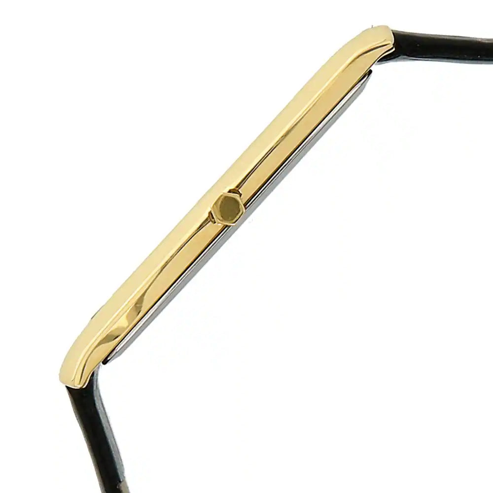 This analog watch for men has a silver dial, featuring two plain hands and Roman numerals at the five minute intervals. The dial is enclosed in a gold case that has a crown. Made of leather, its black strap is fitted with a buckle closure for maximum comfort to the wearer.