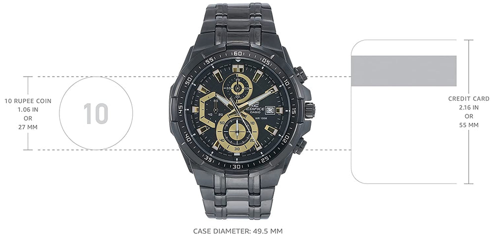 Casio created a multi-functional Edifice EFR-539BK watch inspired from motor sports. Evolved through the power of electronics with striking appearance by blending a dynamic form and intricately detailed watch face, this watch features a vast array of functions perceived through advanced technology that runs the uniquely designed disk dial & watch hands. EFR-539BK has luminous coating that provides illumination in the dark. It has tough and durable stainless steel wrist strap that gives your watch that classic appeal. Large faces and cases are complimented for powerful designs that really stand out exceptionally on your personality.Key Features: Current date is displayed Stopwatch measure elapsed times with split-second accuracy function upto 30 minutes The tough Mineral glass is scratch-resistant & protects the watch against unsightly damage Screw locked back connection on the base protects the inner workings of the watch and also provides easy access while changing the battery Watch has secure safety catch that helps to prevent the strap from opening by mistake The battery supply sufficient energy for approx. two years in the watch The watch can be flaunted in water sports upto 10 bar / 100 metres