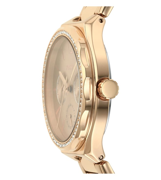 Amaze everyone around you by wearing this women's analog watch from Fossil. The rose gold round dial is protected by a mineral glass. It features multifunction, and a crown for time adjustment. The strap comes in a rose gold hue that further elevates the look of the timekeeper. Besides, it is completed with a push button clasp clasp to ensure a secure fit on the wrist.