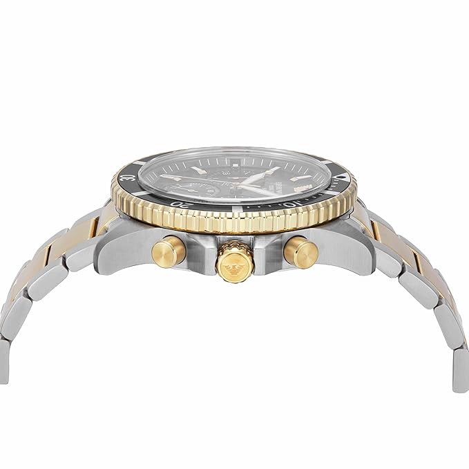 Armani men's solar/chronograph watch from the Spring collection. Watch with a round shape, satin-finished stainless steel case in silver and gold. Case size: 43 mm. Thickness: 13 MM. The glass is transparent. The dial is black. Lug distance: 22 MM. The strap is a mixed-finish stainless steel bracelet. The color is silver and gold with a deployant clasp. Water resistance of 10 ATM. The reference is AR11680