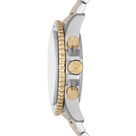 Emporio Armani AR11362 is an amazing and attractive Gents watch. Case material is Stainless Steel, which stands for a high quality of the item and the Blue dial gives the watch that unique look. The features of the watch include (among others) a chronograph. This model has 100 metres water resistancy - it is suitable for swimming, but not high impact. The watch is shipped with an original box and a guarantee from the manufacturer. This 43mm watch features a green cd finish, matte dial with pale gold stick indexes with white luminova, chronograph movement and two-tone stainless steel bracelet.