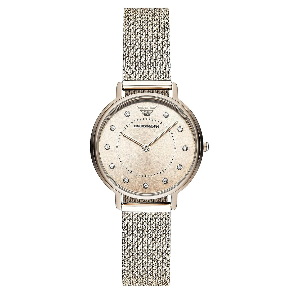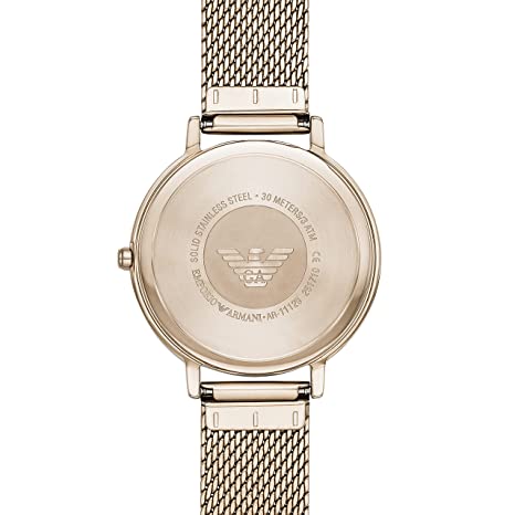 A must-have timepiece for all the watch aficionados, this women's analog watch from Emporio Armani will be a perfect pick. Its strap vaunts a rose gold hue that enhances the look of the watch. Housed in a case, the rose gold round dial is protected by a mineral glass. It showcases plain 2-hand, and a crown for time adjustment. Furthermore, it is complemented with a deployment clasp clasp that ensures a secure fit on the wrist.