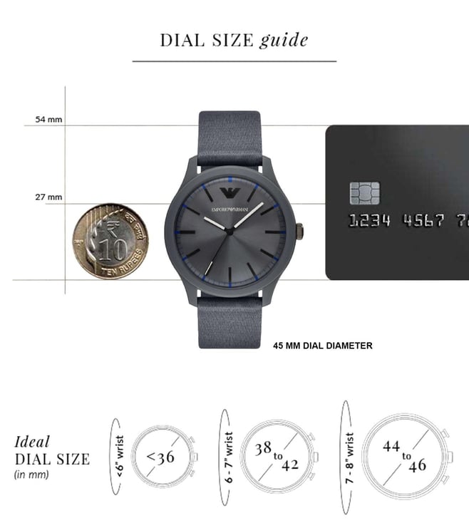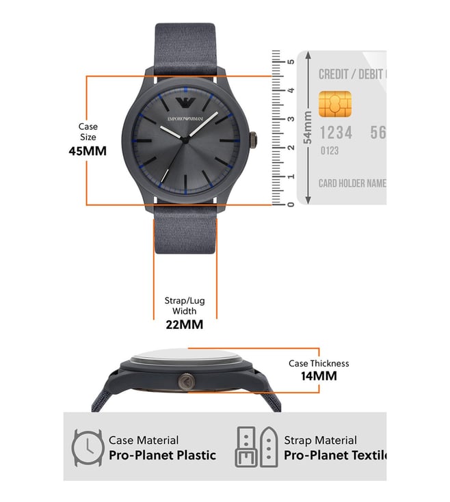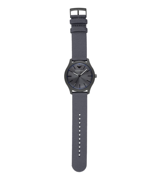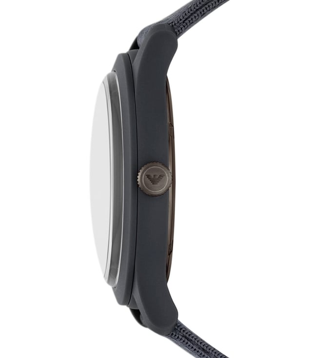 Emporio Armani's 45mm watch features a #tide ocean material¿ matte case, grey sunray dial, three-hand movement and grey #tide ocean material¿ strap. Amaze everyone around you by wearing this men's analog watch from the collection by Emporio Armani. The grey round dial is protected by a mineral glass. It features a crown for time adjustment.