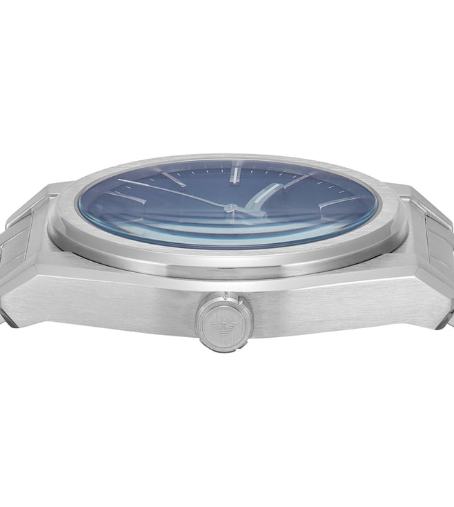 Emporio Armani's 41mm watch features a blue cd sunray dial, three-hand date movement and stainless steel bracelet. Amaze everyone around you by wearing this men's analog watch from the collection by Emporio Armani. The blue round dial is protected by a mineral glass. It features a crown for time adjustment.