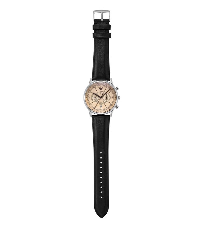 Emporio Armani's 42mm watch features a white matte dial with amber crystal, chronograph movement with telemeter and black leather strap. Amaze everyone around you by wearing this men's analog watch from the collection by Emporio Armani. The white round dial is protected by a mineral glass. It features a crown for time adjustment.