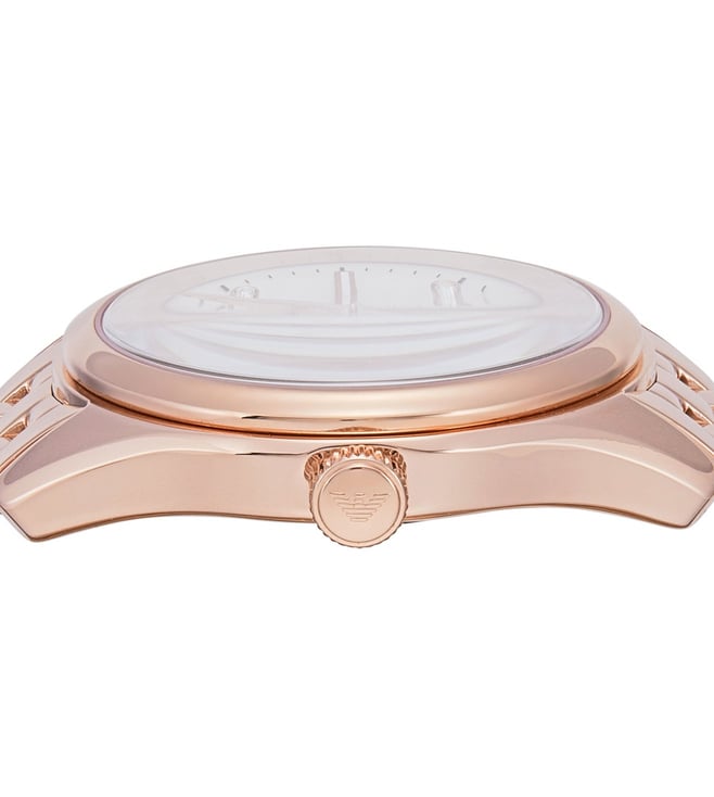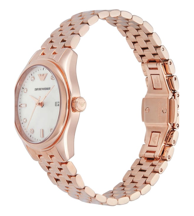 Emporio Armani's 32mm watch features a white mother-of-pearl dial, three-hand date movement and rose gold-tone stainless steel bracelet. Amaze everyone around you by wearing this women's analog watch from the collection by Emporio Armani. The two tone round dial is protected by a mineral glass. It features a crown for time adjustment.