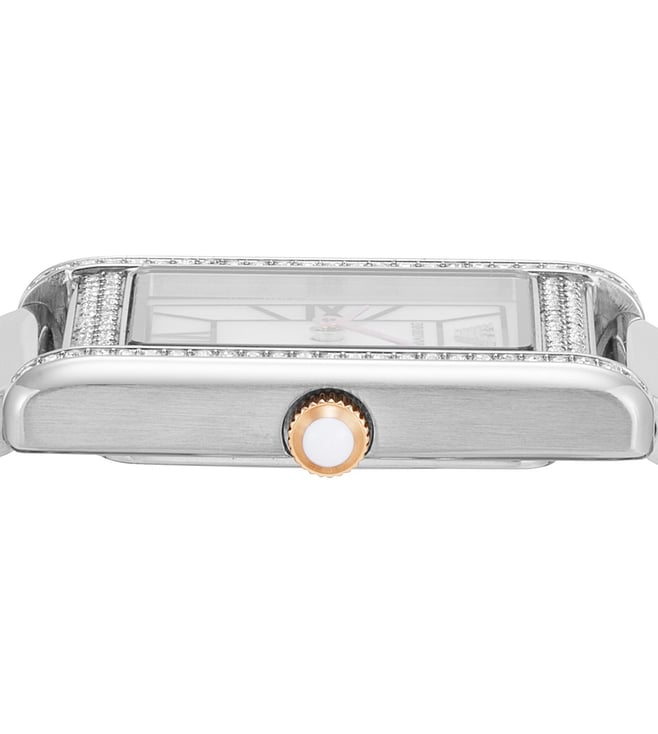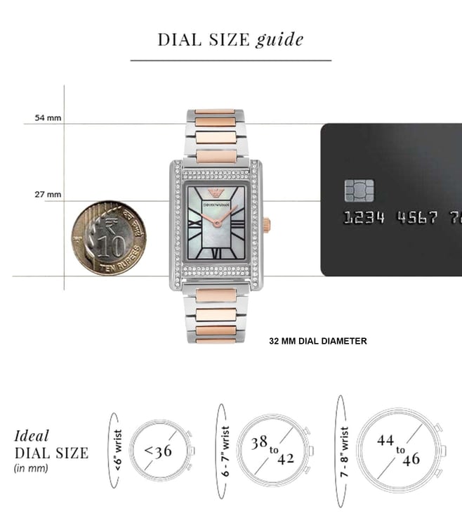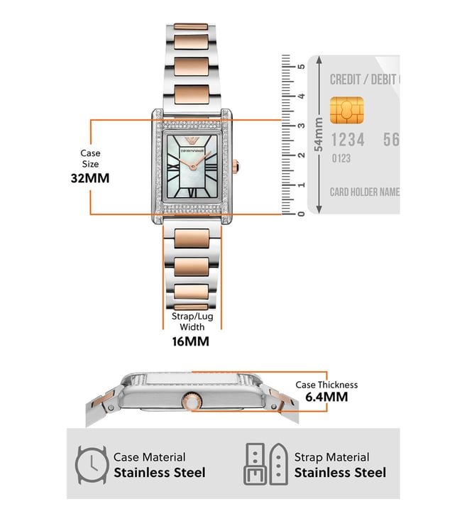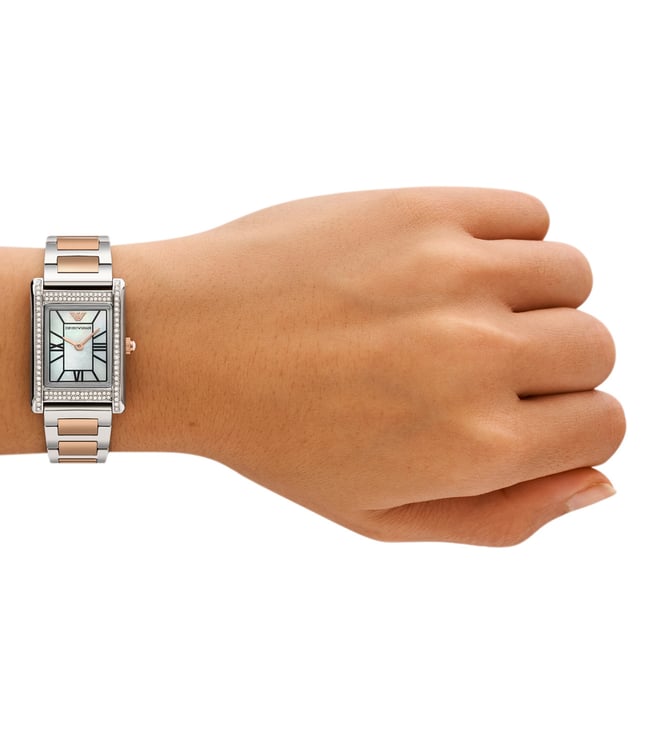Emporio Armani's 22mm x 32mm watch features a mother-of-pearl dial, two-hand movement and two-tone stainless steel bracelet. Amaze everyone around you by wearing this women's analog watch from the collection by Emporio Armani. The mother of pearl rectangular dial is protected by a mineral glass. It features a crown for time adjustment.
