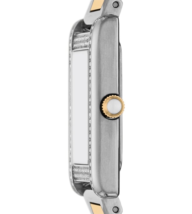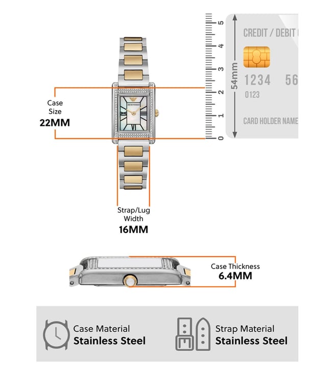 Emporio Armani's 22mm x 32mm watch features a white mother-of-pearl dial, two-hand movement and two-tone stainless steel bracelet.if you are looking for a refined look. Known for its distinctive pattern, this timepiece stands out. With a stunning design and charming looks, this is an exquisite wristwatch made for Every one.