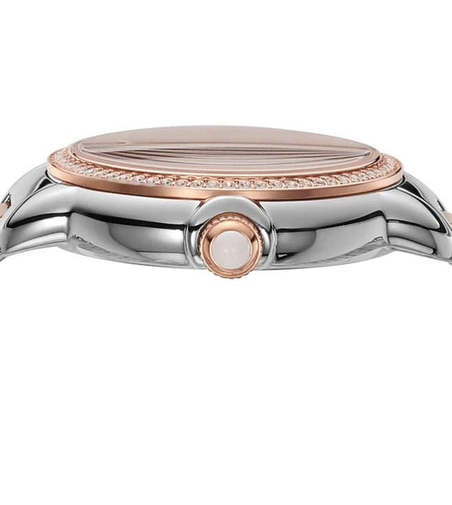 A must-have timepiece for all the watch aficionados, this women's analog watch from Emporio Armani will be a perfect pick. The silver round dial is protected by a mineral glass. It has a crown for time adjustment. The stainless steel strap comes in a two tone hue that further elevates the look of the timekeeper. Besides, it is completed with a deployment clasp to ensure a secure fit on the wrist.