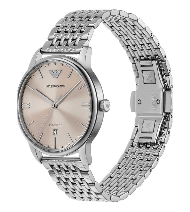 Emporio Armani's 39mm watch features an eggshell sunray dial, automatic movement, date window at 6 o'clock and stainless steel bracelet. Amaze everyone around you by wearing this men's analog watch from the collection by Emporio Armani. The white round dial is protected by a mineral glass. It features a crown for time adjustment.