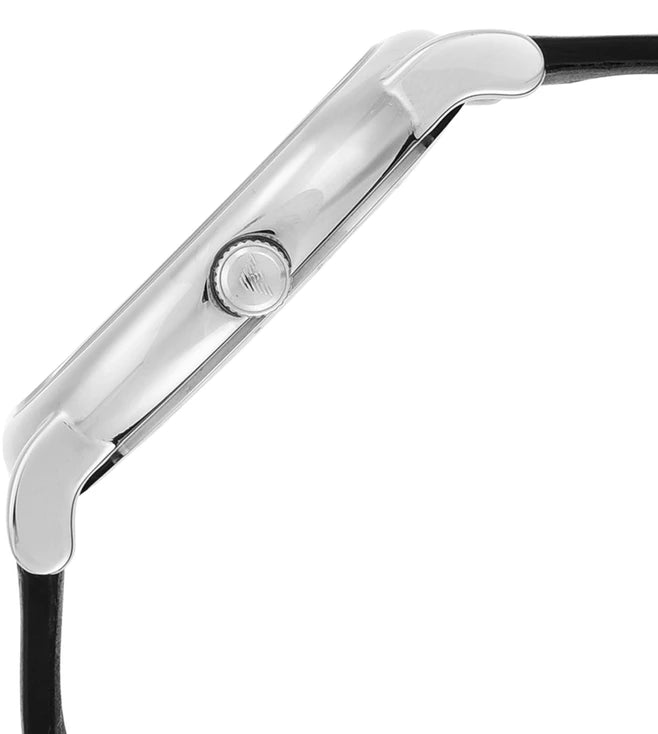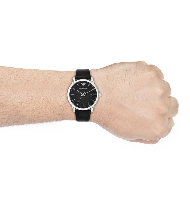 With its minimalistic approach, this watch by Emporio Armani for men offers an insight into the company's glorious history. This contemporary Luigi stainless-steel watch features a minimalist black sunray dial, date window and black leather strap.