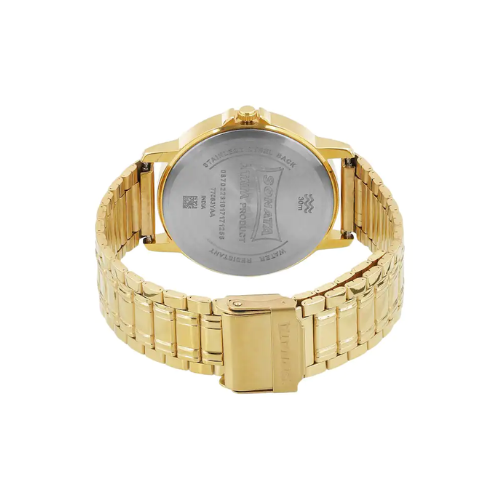 Safeguarded by a mineral glass and operated by a quartz movement, the white round dial is encompassed in a 38 mm case. It showcases plain three hands, numeral markings at five-minute intervals and a crown for time adjustment. Furthermore, it is complemented with a hook buckle clasp that ensures a secure fit on the wrist. Enhance your style quotient by wearing this men's analog watch from the Essentials collection by Sonata. Its stainless steel strap exudes a golden hue that accentuates the look of the watch.