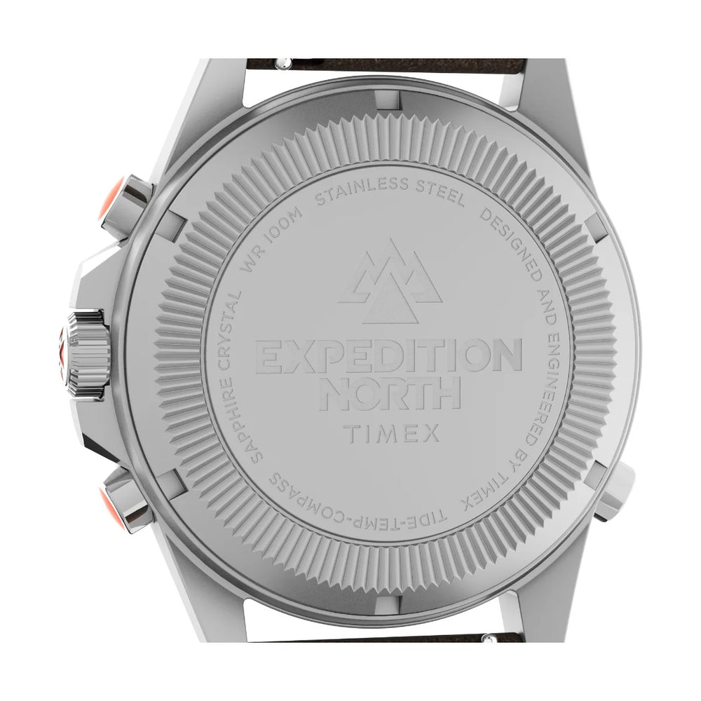 Crafted from 316L stainless steel, this timepiece is literally built for the long haul, from the curves of its rugged case to the tactile experience of its pushers. The watch also features an anti-reflective sapphire crystal, luminescent hands and hour markers, a comfortableEcco™ DriTan™ leather strap, and a water resistance rating of 100 meters. And thanks to our proprietary Tide-Temp-Compass movement’s bidirectional center hand that reflects local tide and temperature conditions and points you in the right direction, our Expedition North Tide-Temp-Compass is a must-have piece of gear to take you from street to summit and back again.