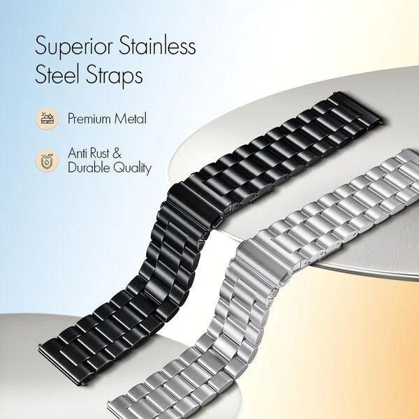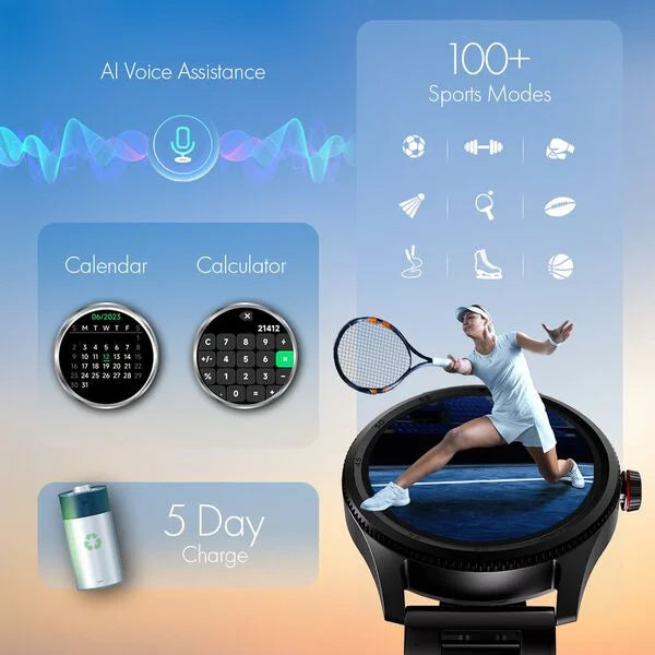 Fastrack Magnus FX1 Luxury Metal Smartwatch with High Definition 3.5 cm UltraVU Display and SingleSync BT Calling. The product packs a Functional Crown and Premium Metal Design. Enjoy the best in class features like SingleSync BT Calling, 100+ Sports Modes with Sports Records, 100+ Watchfaces, Auto Stress Monitor, 24x7 HRM, SpO2 and Sleep Monitor, In-Built Games, AI Voice Assistant, Calendar, Calculator, Weather Display, Power Saving Mode